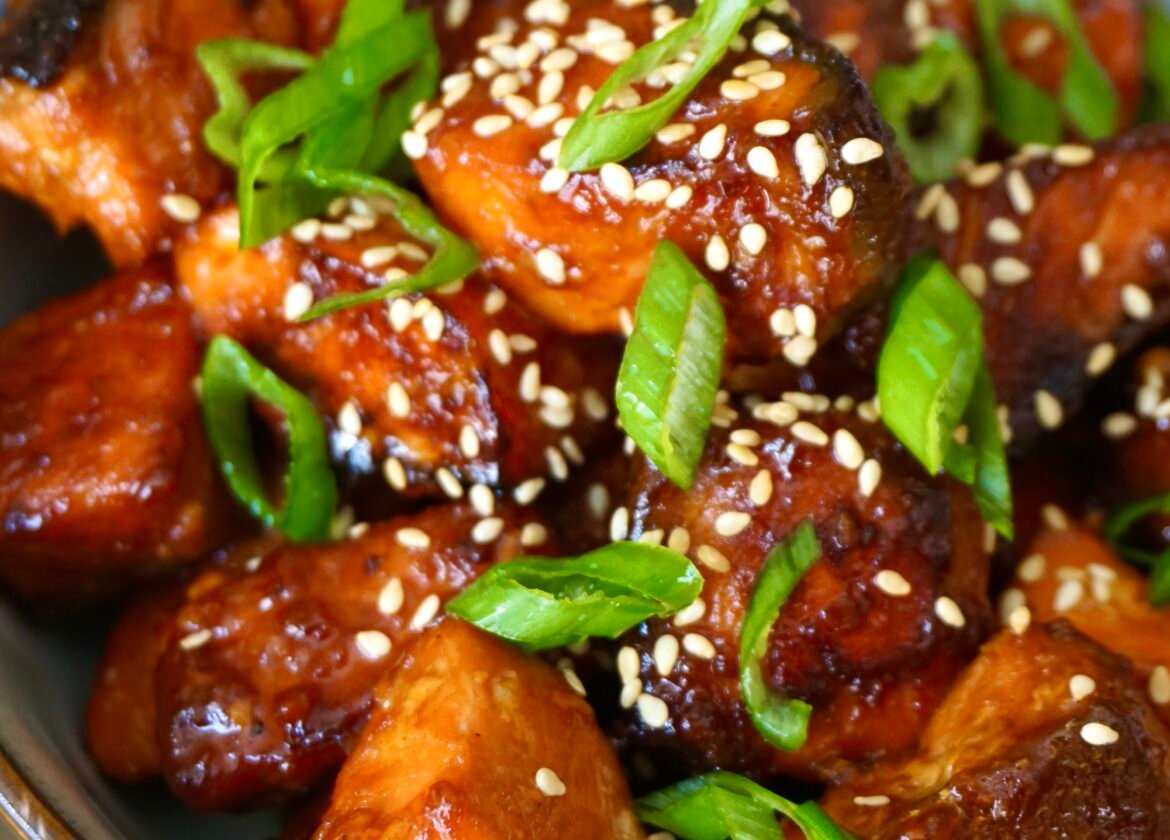 The salmon bites are first marinated in a sweet and savory marinade, then coated with a caramelized honey gochujang sauce. The caramelization of the honey intensifies the sugars which results in a nutty and sweet flavor.