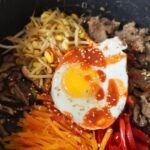 On top of the rice, add bell pepper, bean sprouts, mushrooms, carrots, egg, and the marinated beef.