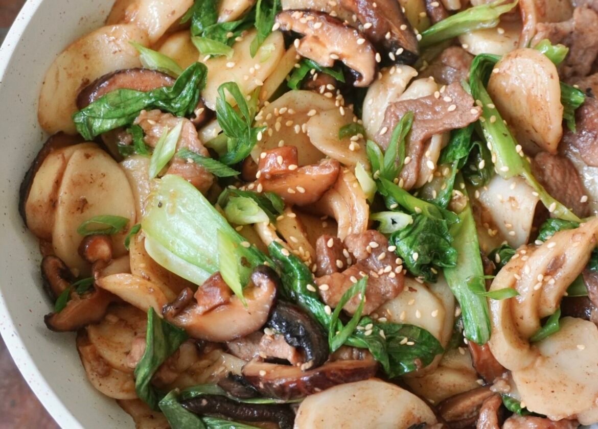 - Stir the rice cakes to incorporate all the ingredients and top with sesame seeds and chopped green onions.